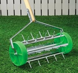 ROLLING LAWN AERATORMAKES A GREENER LAWNRoll your way to a greener lawn! Our simple garden tool loosens and aerates compact turf and soil; lets air, moisture and nutrients reach down to grass roots. Twenty seven 2" long galvanized steel spikes easily maneuver on 5 3/4" diameter plastic wheels. About 16 1/2" wide; fits on standard broom handle (not included). Easy assembly instructions included.
