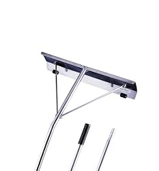 The Garelick 24-inch lightweight aluminum roof rake removes snow from your roof while you are at ground level. This rake prevents eave damage due to heavy snow loads and ice dams from forming. It also lets you remove the snow without climbing or damaging your shingles. The rake features a 3-piece snap pin handle that can reach up to 16 feet and a 24-inch blade with poly roller glides. The Garelick 24-inch roof rake is made in the USA.