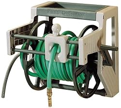 The Ames True Temper hose king hose reel smoothly guides hoses into place with its sliding guide and heavy-duty crank handle. A storage tray and towel bar add convenience, while the 90-degree water system prevents bending of the 4-1/2-foot leader hose, which includes a brass coupling. This reel mounts to the wall and comes unassembled. It measures 22-by-20.5-by-7.2 inches and weighs 10.5 pounds. Ames backs its hose reel with a 7-year warranty.
