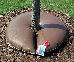 Brown color for low visibility and for low branches. Holds 15 gallons. Size 33" diameter. 6" tall when full. 16 mil brown PVC. Fits up to 4" trees. 4-6 hour drip time; not adjustable. 1 year warranty. 100% absorption with no run-off. Helps reduce transplant stress. Completely saturates root ball, and greatly reduces labor and replacement costs. Recommended for use during water restrictions. 3 year life expectancy.