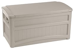 Dress up that patio, deck or porch with the arched, flat-panel design and stylish vertical grooves on this Outdoor Accessories Storage Box from Suncast. Perfect for storing outdoor furniture cushions and accessories, this storage box is equipped with smooth-rolling casters for easy transport over deck beams, stone patios and grass. Suncast's innovative stay-dry design keeps moisture and condensation out, for clean, reliable, long-term storage. A durable resin construction ensures years of dependable storage. Plus, easy five-minute, tool-free assembly will have this unit at the ready shortly after delivery. Carrying handles make it easy to carry this unit up steps and lift it over thresholds.