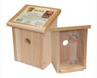 Nest View Bird House. Watch birds build their nest and raise their young. Clear panel for great view. Entrance hole measures 1 1/2 inch. 8.00 inches tall x 6.50 inches long x 5.50 inches wide