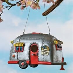 Give your feathered friends a "tweet" place to sleep! This adorable birdhouse is reminiscent of the old classic Airstream Campers. It's bright striped awnings and red door make it a cozy retreat. A posted sign announces "Trailer For Sale or Rent." Made of resin. Measures 8.5"L x 4.5"W x 5"H and comes with a 9" wire for quick hanging. Great for your backyard or to take along with you as you set up camp on your own travels. A must have for the RV'er or road warrior!